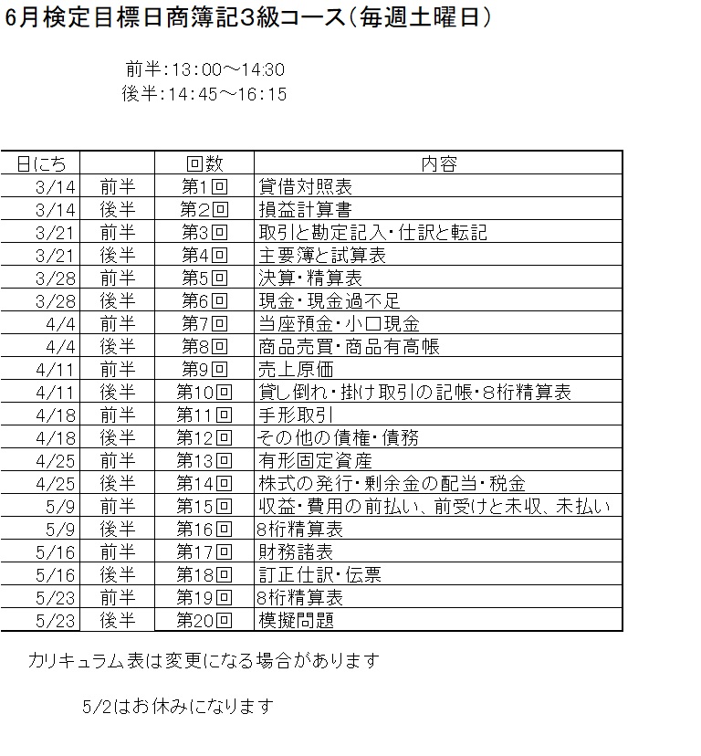 令和8年6月検定目標 日商簿記3級コースカリキュラム表